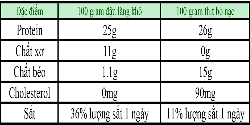Dưới đây là so sánh về lượng đạm và dinh dưỡng giữa đậu lăng và thịt bò (theo bộ Nông nghiệp Mỹ USDA).