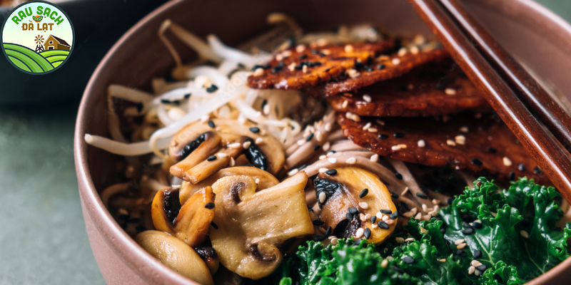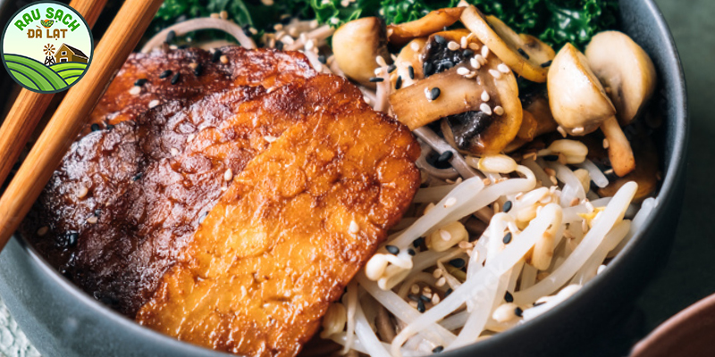 100 gram tempeh ướp áp chảo có thể thay bằng đậu phụ rán. 100 gram nấm và giá.