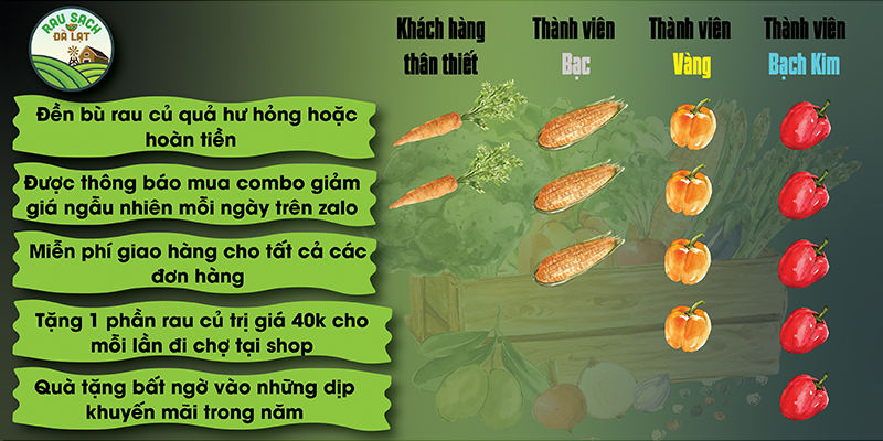 Shop rất hạnh phúc và vinh dự khi được mọi người tin tưởng giao cho nhiệm vụ chọn lựa rau củ quả sạch, tươi ngon cho bữa cơm gia đình. Vì vậy shop có những ưu đãi dành riêng cho khách hàng thân thiết của mình như sau:
